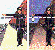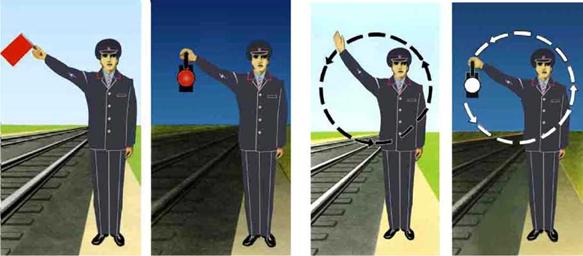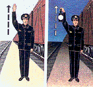 1) разрешается локомотиву следовать управлением вперед - днем движением поднятой вверх руки с развернутым желтым флагом; ночью - ручного фонаря с прозрачно-белым огнем или одним длинным звуком;