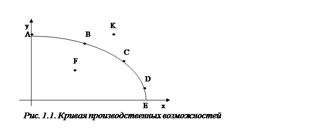 Каждая точка кривой АЕ показывает все возможные соотношения производства продукции при полном использовании всех имеющихся ресурсов, поэтому она носит название кривой производственных возможностей. Точки, которые лежат за пределами кривой, показывают объемы производства, которые невозможно достичь при имеющихся производственных ресурсах (точка К). Точки, которые находятся ниже кривой производственных возможностей, свидетельствуют о неполном использовании имеющихся ресурсов (точка Е).