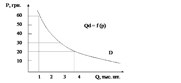 Между ценой товара и количеством проданного товара существует определенная связь. Чем ниже цена товара, тем большее его количество готовы купить покупатели, тем выше на него спрос [1, 2, 3]. Обратная зависимость между ценой товара и величиной спроса называется законам спроса (law of demond). Кривая спроса (demond curve) показывает, какое количество экономического блага готовы приобрести покупатели по разным ценам в данный момент времени. В экономической теории принято откладывать независимую переменную (цену) по вертикальной, а зависимую (спрос) по горизонтальной оси (рис. 2.1).