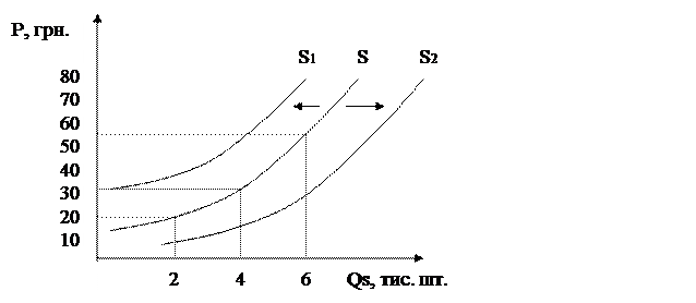 Величина предложения является функцией всех этих факторов. Например, повышение цены на факторы производства означает сокращение предложения, то есть сдвиг S в положение S1. И, наоборот, в случае снижения цен на факторы производства наблюдается увеличение предложения, которое приведет к сдвигу кривой S положение S2. Движение вдоль кривой предложения отображает изменение величины предложения. Сдвиг кривой предложения влево или вправо отображает изменение предложения, которое происходит под влиянием факторов, которые определяют функцию предложения.