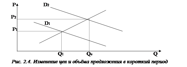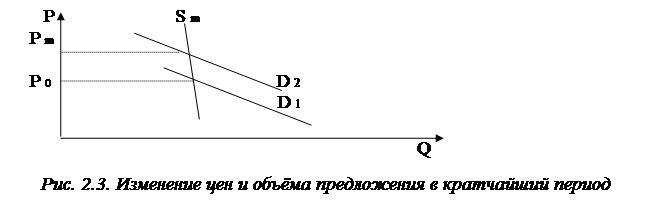 В кратчайшем периоде все факторы производства постоянные, в краткосрочном — некоторые факторы (сырье, рабочее сила и др.) являются переменными. В долгосрочном периоде — все факторы производства переменные, включая производственные мощности и число фирм в отрасли. В условиях кратчайшего рыночного периода рост (снижение) спроса приводит к повышению (снижение) цен, но не отражается на величине предложения (рис 2.3).