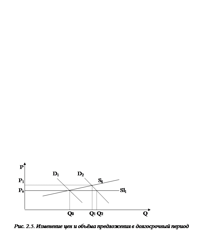 В условиях короткого периода повышения спроса обусловливает не только рост цен, но и увеличение объема производства, потому что фирмы успевают изменить некоторые факторы производства в соответствии со спросом (рис 2.4). В условиях долгосрочного периода увеличение спроса приводит к значительному росту предложения при несущественном повышении цен (рис. 2.5) [1].