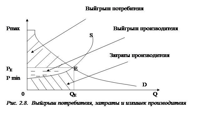 Поскольку цена равновесия обычно ниже максимальной предлагаемой потребителями цены, величину излишка (выигрыша) потребителя (соnsuмеr's surplus) определяют как площадь Рmах Е Ре (рис. 2.8).