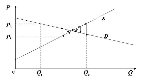 . Под влиянием этой цены производители, надеясь, что она сохранится неизменной и дальше, в следующем периоде сократят объем предложения. Такой характер движения (на графике изображен стрелками) будет длиться до тех пор, пока цена не достигнет равновесной точки Е.