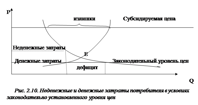 Государственная фиксация цен означает отключение механизма рыночной координации. Когда цена устанавливается (лимитируется) ниже равновесного уровня, образуется дефицит, к тому же к денежным расходам потребителя добавляются не денежные расходы (поиск товаров, ожидание в очереди) (рис. 2.10).