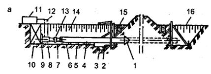 Усилие сообщается прокладываемой трубе нажимными патрубками через задний торец. Нажимные патрубки представляют собой отрезки труб длиной, равной ходу штока домкрата. К торцам их с помощью косынок привариваются фланцы. Домкрат через нажимной патрубок и подкладку давит непосредственно в торец трубы. После вдавливания трубы в грунт на длину хода штока домкрата (например, 1 м) шток возвращается в первоначальное положение и в образовавшееся пространство вставляется другой патрубок удвоенной длины. Таким образом, с помощью комбинации нажимных патрубков длиной 1 и 2 м вдавливают первое звено трубы. Затем укладывают второе звено трубы и приваривают к предыдущему. Далее процессы повторяют до тех пор, пока проходка не будет доведена до проектной длины.
