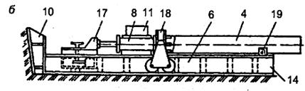 12 – маслопроводы; 13 – нажимная заглушка; 14, 16 – рабочий и приемный котлованы; 15 – обводной лоток; 17 – подвижный упор; 78 – нажимная плита на тележке; 19 – фиксатор; 20 – свая; 21 – лебедка; 22 – рама; 23 – планка;