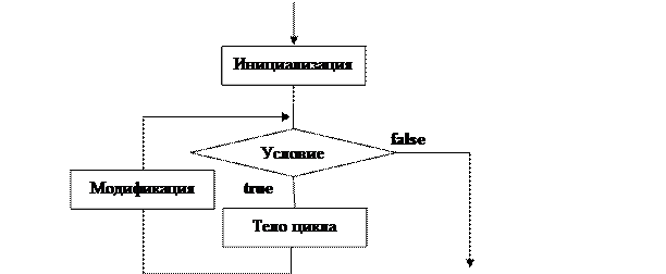 При запуске цикла однократно выполняется Инициализация параметра (параметров) цикла, после чего осуществляется проверка Условия, определяющего необходимость выполнения тела цикла. После окончания выполнения инструкций тела цикла, на каждой итерации выполняется Модификация параметра (параметров) цикла и снова проверяется Условие. Так продолжается до тех пор, пока Условие не станет ложным (false).