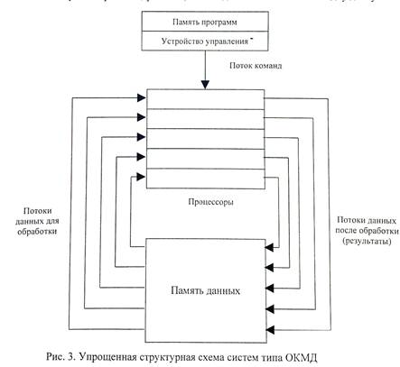 Тот факт, что системы типа ОКМДС могут быть как с низкой, так и с высокой степенью связанности, отмечен условно на рисунке 8 при помощи прерывистой линии, связывающей изображения процессоров.