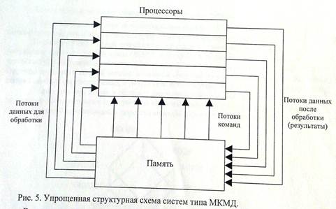 реализуется асинхронный параллельный вычислительный процесс. Такие системы обладают большой гибкостью. Реальная скорость обработки информации зависит от возможностей загрузки процессоров, однако, если распараллеливание вычислений при выполнении данной программы затруднено, то можно, воспользовавшись наличием нескольких устройств управления, одновременно выполнять несколько программ, повышая тем самым загрузку процессоров. Системы типа МКМД отличаются высокой надежностью вследствие хороших возможностей взаимного резервирования однотипных устройств и машин.