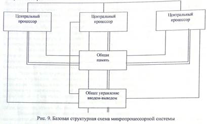 Следует отметить, что взаимодействие аппаратных и программных средств зависит не только от организации взаимных связей, но и от системного программного обеспечения и процедур обработки данных. Базовая структурная схема многопроцессорной системы изображена на рис. 9.