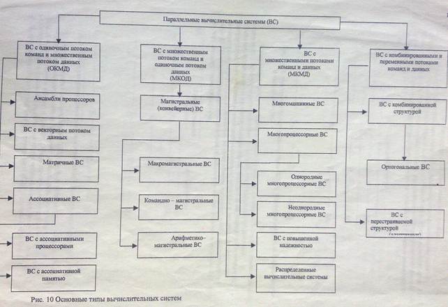 Основные типы параллельных вычислительных систем представлены на рис. 10. На этом рисунке выделены однородные и неоднородные многопроцессорные вычислительные системы, поскольку характеристики однородности и неоднородности в большой степени влияют на структуру многопроцессорных систем в силу их сильной связанности.