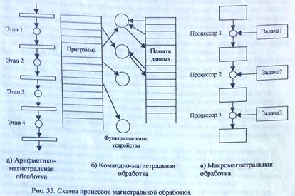 В качестве основных уровней реализации магистрального принципа можно выделить уровень устройств выполнения элементарных операций над битами данных, уровень арифмегико-логических устройств и уровень управляющих устройств, которым сопоставляются арифметико-магистральвая, командно-магистральная и макромагистральвая обработка соответственно. Схемы процессов трех указанных видов магистральной обработки приведены на рис. 35.