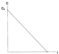 В реакциях нулевого порядка концентрация исходного вещества линейно уменьшается со временем (рис. 37)