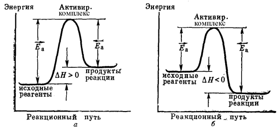 На рис. 43 представлены энергетические диаграммы эндотермической (а) и экзотермической (б) реакций, поясняющие вышесказанные представления. Здесь по горизонтали отложен ход процесса, а по вертикали – энергия рассматриваемой совокупности веществ;