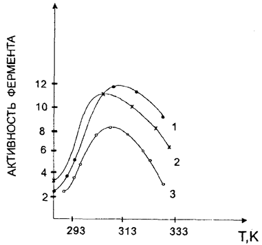 Рис. 45. Активность фермента трипсина в различных организмах от температуры: 1 – собака, 2 – окунь, 3 – треска