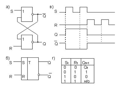 Асинхронный RS-триггер на элементах ИЛИ-НЕ имеет два входа (S и R) для раздельной установки состояний О и 1. При подаче единичного сигнала на вход S триггер устанавливается в состояние 1 (при этом Q=l), а на вход R - в состояние О (Q=0). При одновременной подаче сигналов на оба управляющих входа триггер окажется в неопределенном состоянии (Н/О) (рис. 4.1г). Поэтому одновременная подача cигналов на оба входа RS-триггеров запрещается.