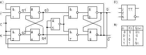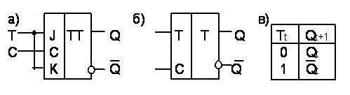 Синхронный Т-триггер можно получить из JK-триггера путем объединения входов J и К в один, который называется Т- входом (счетным входом). Получение Т-триггера из JK- триггера поясняется рис. 4.4 а.