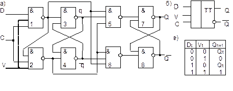 D-триггеры. Прием информации осуществляется по одному D-входу. Син хронный двухступенчатый D - триггер организован из двух одноступенчатых триггеров (рис. 4.5 а). В качестве первой ступени служит синхронный D-триггер со статическим управлением записью, а для второй ступени использован RS-триггер с инверсными входами. Обозначение на функциональных схемах показано на рис. 4.5 б. Двухступенчатый DV-триггер можно получить из D-триггера путем введения управляющего V-входа, как это показано пунктирной линией на рис. 4.5 а. Таблица переходов DV-триггера приведена на рис. 4.5 в.