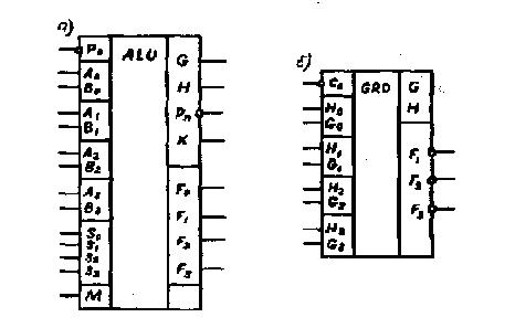 В состав многих серий микросхем входят модули арифметико-логических устройств (АЛУ), где над входными величинами выполняются арифметические и логические операции, а также блок ускоренного переноса для этого АЛУ. Примером таких блоков служат микросхемы К155ИМЗ, К155ИП4, К1500ИП181, К1500ИП179. Условное обозначение микросхем АЛУ приведено на рис. 4.14 а.