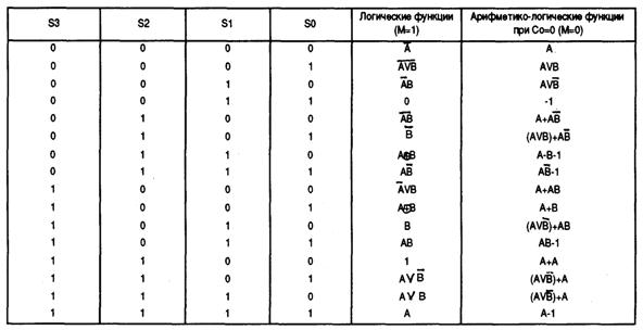 Вход М задает характер выполняемых операций. Если M=1, то в зависимости от комбинаций сигналов Si выполняется любая из 16 логических операций. При М=0, то в схеме выполняются арифметические операции. Перечень операций, выполняемых АЛУ К155ИПЗ, приводится в табл. 4.3.