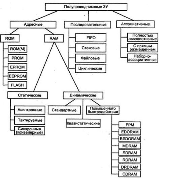 По методам размещения и способу поиска информации различают адресную, магазинную (стековую) и ассоциативную память (или ассоциативное ЗУ АЗУ).