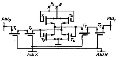 В настоящее время промышленностью изготавливаются два основных типа ЗЭ: статические и динамические. Пример схемы статического ЗЭ на МОП транзисторах показан на рис. 5.2. ЗЭ состоит из триггера, реализованного на транзисторах T5 и T6. Транзисторы Т1, T2, Т7 и Т8 являются управляющими, посредством которых производится выборка ЭП по адресным шинам X (АШХ) и У (АШУ) подачей напряжений Uax, и Uay. Запись кода "0" и "1" осуществляется подачей напряжений Upo и Up1 на разрядные шины РШ0 и РШ1 при наличии напряжений выборки Uax и Uay. Считывание осуществляется также подачей напряжений выборки Uax и Uay. Состояние ЭП снимается с РШ0 и РШ1. Транзисторы Т3 и Т4 являются нагрузочными.