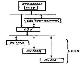 Иерархическая организация ЗУ. Пользователи ЭВМ хотели бы иметь в своем распоряжении ЗУ неограниченной емкости и высокого быстродействия. Несмотря на непрерывное увеличение емкости и быстродействия, эти характеристики с учетом ограничений на стоимость ЗУ остаются противоречивыми. Поэтому в ЭВМ применяют несколько типов ЗУ, организованных по иерархическому многоуровневому принципу (рис.5.2).