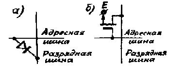 На рис. 5.4 показаны диодный и транзисторный элементы памяти ПЗУ. Выбор требуемого ЭП производится подачей сигнала выборки на адресную шину 5.4 а. При этом единичный уровень установится на тех разрядных шинах, которые связаны через диоды с данной адресной шиной. Запись информации в диодные ПЗУ осуществляется выжиганием ненужных диодов. На рис. 5.4 б показан элемент памяти на МДП транзисторах, который выполняется либо с тонким слоем под затвор, либо с толстым, в зависимости от того, какая информация должна храниться в данном элементе. При подаче напряжения на адресную шину, в элементах с тонким слоем под затвор образуется проводящий канал, а в элементах с толстым слоем проводящий канал не образуется.