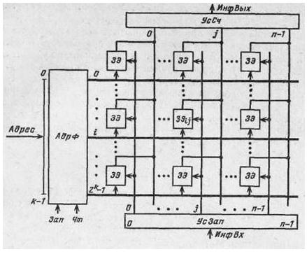 Адрес (k-разрядный) выбираемой ячейки I поступает на схему адресного формирователя АдрФ, управляемого сигналами чтения Чт и записи Зап. Основу АдрФ составляет дешифратор с 2к выходами, который при поступлении на его входы адреса формирует сигнал для выборки линии i, при этом под воздействием сигналов Чт и Зап из АдрФ выдается сигнал, настраивающий ЗЭ i-й линии либо на считывание (выдачу сигнала состояния), либо на запись. Выделение разряда j в i-м слове производится второй координатной линией. При записи по линии jот усилителя записи УсЗап поступает сигнал, устанавливающий выбранный для записи 33;, в состояние 0 или 1. При считывании на усилитель считывания УсСч по линии j поступает сигнал о состоянии ячейки.