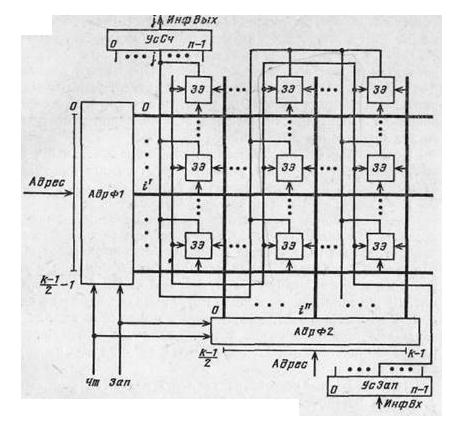 Для построения n-разрядной памяти используется n матриц рассмотренного вида. Адресные формирователи при этом могут быть общими для всех разрядных ЗМ.