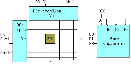 На рисунке 5.7 приведены обозначения: n-адресных входов (A0.. An-1), DIO - двунаправленная восмиразрядная шина данных, вход разрешения выходов - OE, вход выбора микросхемы - CS и вход разрешения записи - WE, который часто обозначают по другому - WR/RD, подчеркивая этим, что при низком значении сигнала на этом входе производится запись байта, а при высоком уровне - чтение. EO, DI, WR - внутренние сигналы вырабатываемые блоком управления чтением/записью/хранением. Доступ к произвольной ЯПj производится с помощью прямоугольного дешифратора, состоящего из двух обычных дешифраторов, причем k-адресных линий заводится на дешифратор столбцов (DCc), а оставшиеся n-k линий подключены к дешифратору строк (DCr). Количество строк и столбцов будет соответственно равно 2(n-k) и 2k, т.е. общее количество, обслуживаемых ЯП, равно 2k * 2(n-k) = 2n.