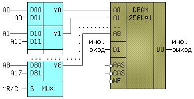 ОЗУ динамического типа (DRAM). В качестве элемента памяти используется микроконденсатор в интегральном исполнении, размеры которого значительно меньше D-триггера статической памяти. По этой причине, при одинаковых размерах кристалла, информационная емкость DRAM выше, чем у SRAM. Количество адресных входов и габариты должны увеличиться.Чтобы не допустить этого, адресные линии внутри микросхемы разбиваются на две группы, например старшая и младшая половина. Две одноименные k-линии каждой группы подключаются к двум выходам внутреннего k-го демультиплексора "1 в 2", а его вход соединяется с k-ым адресным входом микросхемы. Количество адресных входов, при этом уменьшается в два раза, но зато передача адреса в микросхему должна производиться, во-первых в два приема, что несколько уменьшает быстродействие, и во-вторых потребуется дополнительный внешний мультиплексор адреса.В процессе хранения бита конденсатор разряжается. Чтобы этого не допустить заряд необходимо поддерживать.