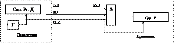 При синхронном методе передатчик генерирует две последовательности - информационную TxD и синхроимпульсы CLK, которые передаются на