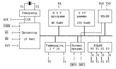 В состав МК51 входят параллельные 8-разрядные квазидвунаправленные порты P0..P3. Порт Р3 может быть использован для ввода и вывода управляющих сигналов.
