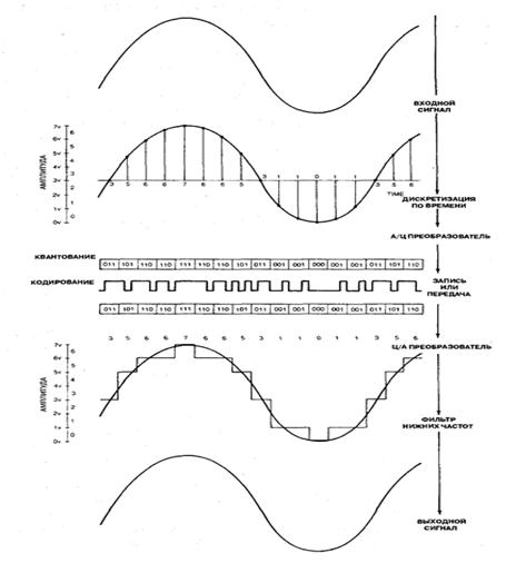 Временная информация кодируется в цифровой системе путем периодического измерения мгновенных значений аналогового сигнала. Дискретное значение аналогового сигнала называют отсчетом. Амплитудная информация кодируется в результате представления значения каждого отсчета при помощи числа. Этот процесс называется квантованием. Таким образом, дискретизация сохраняет временную информацию, квантование — амплитудную.