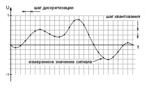 Непрерывный аналоговый сигнал – это сложное по форме колебание, некая зависимость амплитуды сигнала от времени. Преобразование аналогового сигнала в цифровой вид называется аналогово-цифровым преобразованием или оцифровкой. Процесс такого преобразования заключается в осуществлении замеров величины амплитуды аналогового сигнала с некоторым временным шагом (дискретизация) с последующей записью измеренных значений амплитуды в численном виде (квантование).
