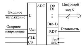 В общем случае микросхема АЦП имеет один аналоговый вход и несколько цифровых выходов (рис. 15.3). Часто микросхема АЦП имеет также вход для подачи тактового сигнала CLK, сигнал разрешения работы CS и сигнал, говорящий о готовности выходного цифрового кода RDY.
