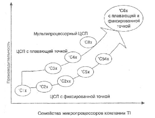 DSP фирмы Texas Instruments представлены следующими микропроцессорами: TMS 32010, TMS 320C20, TMS 320C25, TMS 320C30, TMS 320C40, TMS 320C50.