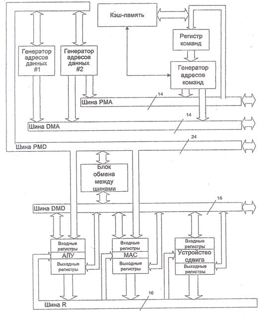 Внутренние функциональные блоки связаны между собой с помощью пяти шин: шина адресов памяти данных (ОМА), шина адресов памяти команд (РМА), шина данных памяти данных (ОМО), шина данных памяти команд (РМО) шина внутренних результатов (R). Первые четыре шины имеют мультиплексированной внешний интерфейс в виде шины адреса и шины данных (см. рис. 15.6).