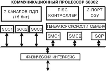 В ПЗУ микрокода изначально содержатся программы, поддерживающие наиболее распространенные протоколы: HDLC, BISYNC, UART, Transparent и другие. Кроме того, программы могут выполняться из двухпортового ОЗУ, что позволяет реализовать практически любой нестандартный протокол и делает данный КМК чрезвычайно универсальным. Три независимых коммуникационных контроллера (SCC) имеют индивидуальные каналы прямого доступа к памяти как на прием, так и на передачу. Взаимодействие со встроенным управляющим процессором 68000 осуществляется через двухпортовое ОЗУ емкостью 1152 байт, половина которого используется для указателей входных/выходных буферов, а вторая половина может использоваться для хранения данных или загрузки микрокода. Коммуникационный процессор обеспечивает одновременную работу всех трех каналов, причем каждый из них может обрабатывать любой из протоколов. Помимо поддержки логических протоколов, МС68302 имеет блок сопряжения с физическими интерфейсами: немультиплексируемый интерфейс с поддержкой модемных сигналов (NMSI) и интерфейсы с временным мультиплексированием, например, ИКМ или ISDN BRI (IDL и GCI). Производительность МС68302 позволяет обрабатывать потоки информации до 2 Мбит/с. Помимо основных последовательных каналов (SCC), МС68302 содержит два контроллера управления обменом SМС, поддерживающие работу с IDL или GCI, а также синхронный последовательный интерфейс SCP.