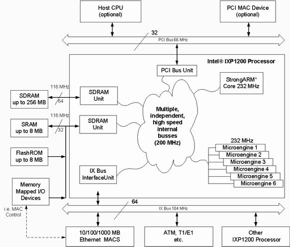 Сетевому процессору IXP1200 отводятся функции обработки, преобразования и маршрутизации пакетов данных, передаваемых по сетям всех типов. Сетевой процессор IXP1200 обладает мощностью, достаточной для выполнения вычислений в процессе передачи данных, а также определенных задач управления сетевой системой.
