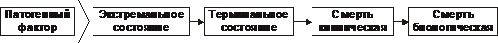 Терминальные состояния обычно являются следствием неблагоприятного течения экстремальных состояний. Если при терминальном состоянии не проводятся интенсивные врачебные мероприятия или они неэффективны, то развивается клиническая и далее — биологическая смерть (рис. 20–1).