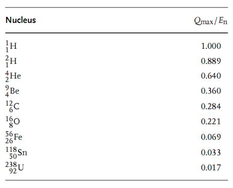 В таб. 6.1 приведены максимальная доля Qmax энергии нейтрона, которая может быть потеряна в столкновении с ядром массы m при M = 1