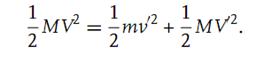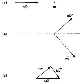 После столкновения (6.3(b)) ядро и нейтрон имеют импульсы m v и M V¢. Закон сохранения импульса требует, что бы сумма векторов m v + M V¢ была равна начальному вектору M V, как показано на 6.3(с), а закон сохранения энергии: