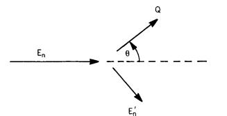 Если M = m, тогда V2 = v¢2 +V2 и угол между векторами v¢ и V¢ прямой. Энергия ядра отдачи и угол рассеяния однозначно связаны с энергией нейтрона. Например, когда нейтрон с энергией En сталкивается с протоном, получающим при этом энергию Q при угле рассеяния θ (рис. (6.4)), тогда из законов сохранения энергии и импульса следует