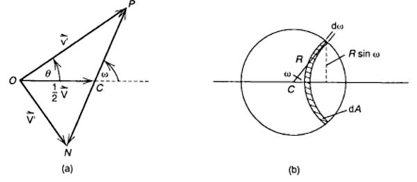 Рис. 6.4 (a) Схема в ЛСК. Позиции нейтрона N и протона P после столкновения в точке O. За единицу времени их смещение по численно совпадает с с векторами скоростей v¢ и V¢. Центр масс С смещается на V /2 и делит пополам линию NP. Протон рассеивается на угол θ в ЛСК и на угол ω в СЦМ (b). Сфера радиуса R с центром C в СЦМ. Для изотропного рассеяния вероятность, что протон пройдёт через некоторую площадку на сфере, пропорциональна её площади.