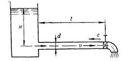 Труба длиной l одним концом присоединена к большому резервуару, а на другом конце имеет задвижку (рис.2-11). Жидкость в трубе движется со скоростью v. Прекратим движение жидкости быстрым закрытием задвижки. В результате кинетическая энергия движущейся массы жидкости преобразуется в энергию давления (потенциальную энергию), и давление в трубе у задвижки резко возрастает.