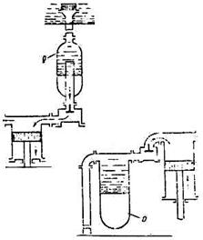 При этом может возникать деформация труб, их разрывы, опасность гидравлических ударов, поломка КИПов. Эти явления можно уменьшить установкой воздушных колпаков - гидроаккумуляторов, которые воспринимают на себя избыток жидкости. Эти колпаки представляют собой полый сосуд, установленный на всасывании или нагнетании насоса.