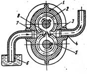 Ведущая 2 и ведомая 5 шестерни расположены в корпусе 1 и находятся во внешнем зацеплении. При показанном на рисунке направлении вращения патрубок 6 будет всасывающим, а патрубок 4 — нагнетательным.